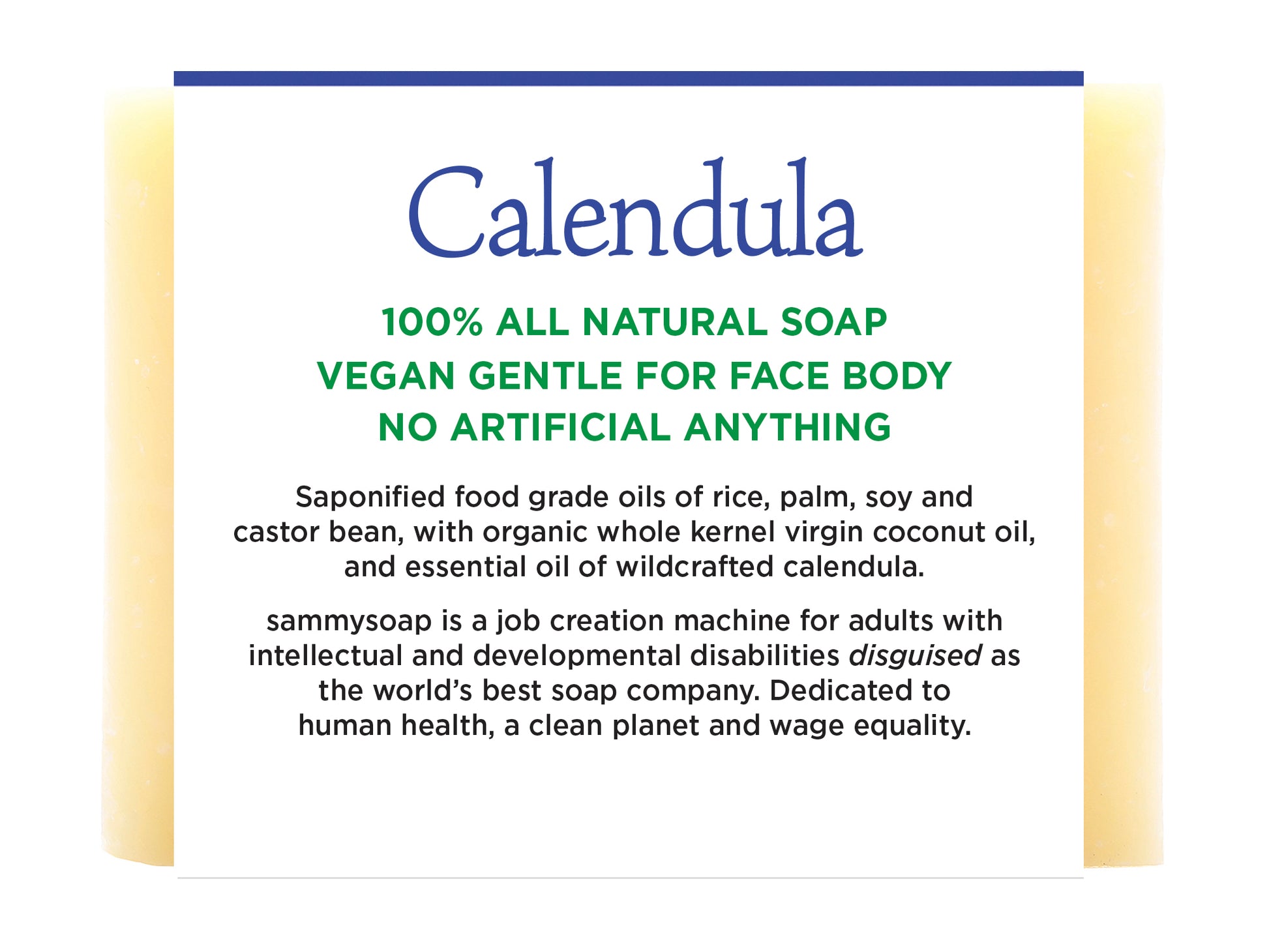 Saponified food grade oils of rice, palm, soy and castor bean, organic whole kernel virgin coconut oil, essential oils of wildcrafted calendula Calendula.