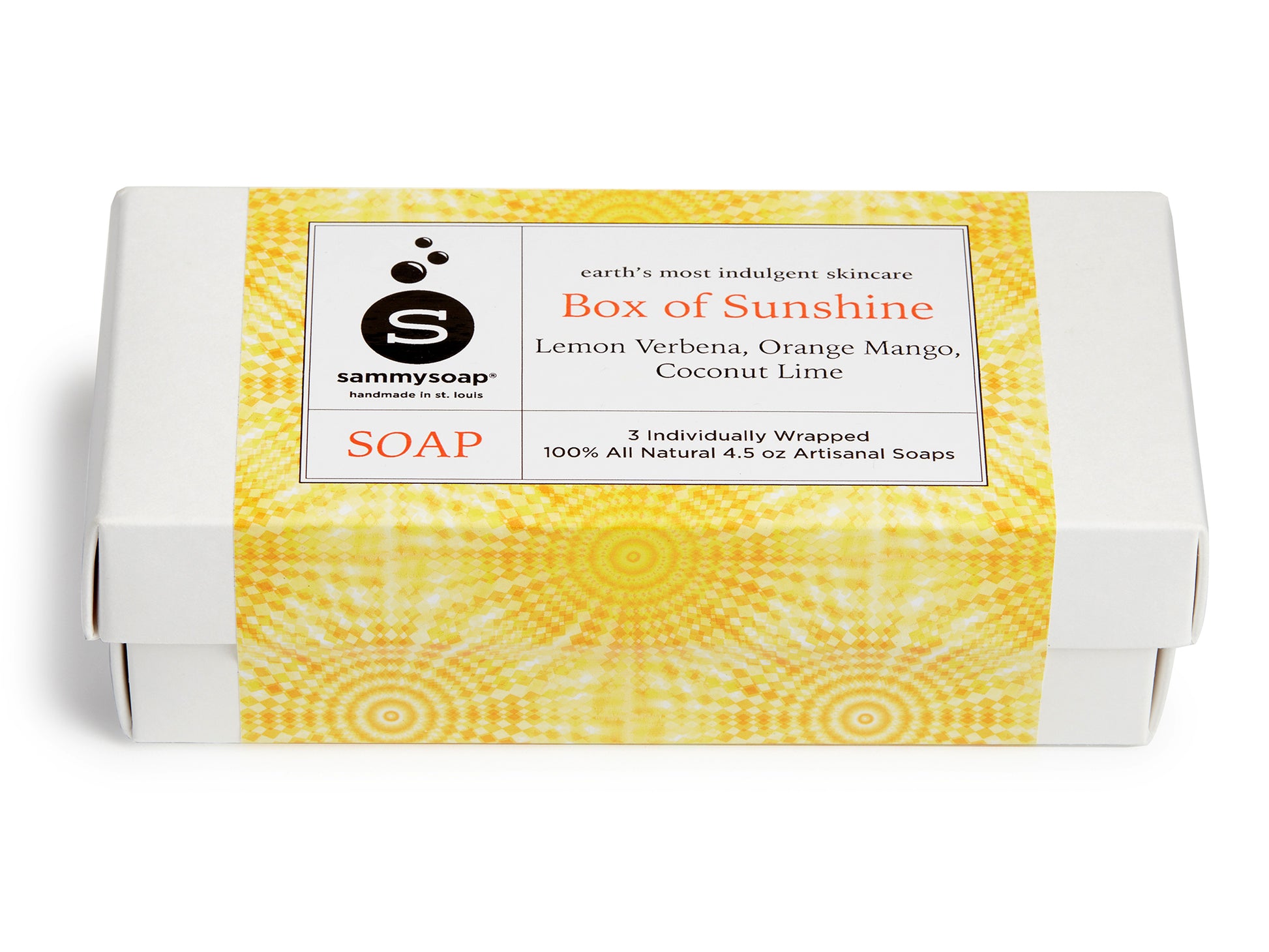 Three individually wrapped 100% all natural 4.5 oz artisanal soaps in a gorgeous gift box.