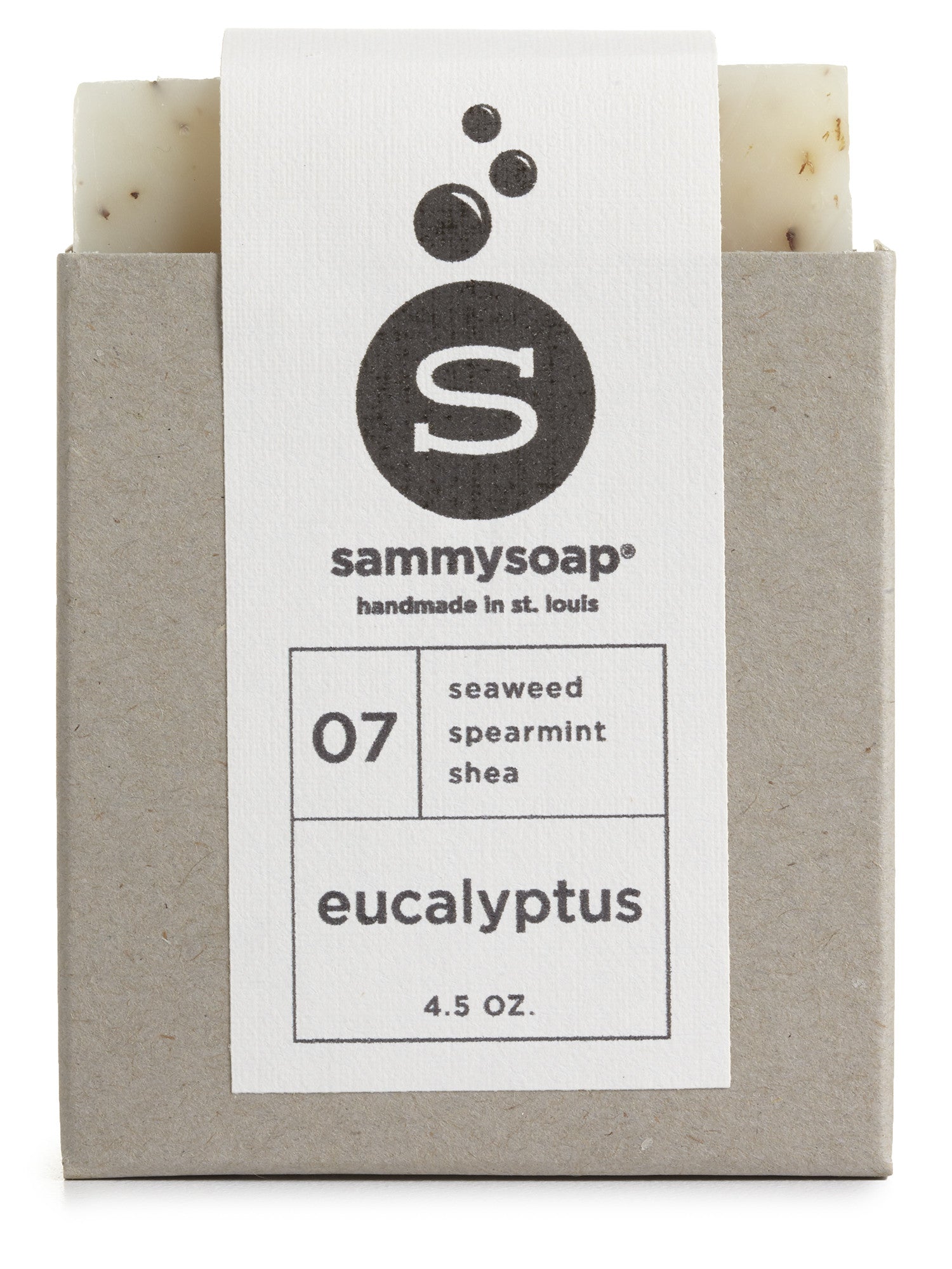Saponified food grade oils of rice Oryza sativa, palm Elaesis guineensis, soy Glycine max and castor Ricinus communes, with essential oil of eucalyptus Eucalyptus globules USA, shea nut butter Butyrospermum parkii Ghana, essential oil of spearmint Mentha spicata USA, organic crushed mint leaves Mentha canadensis USA, and seaweed.