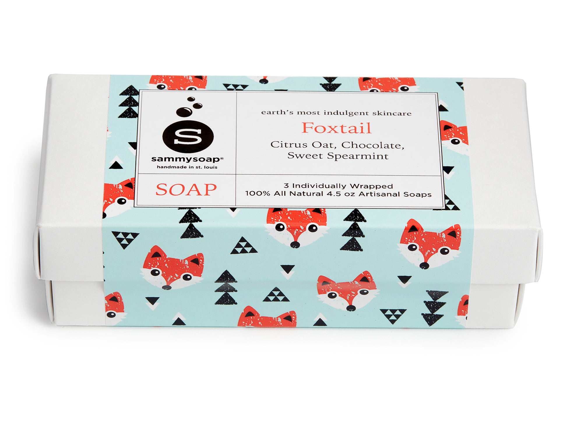 Three individually wrapped 100% all natural 4.5 oz artisanal soaps in a playful gift box.