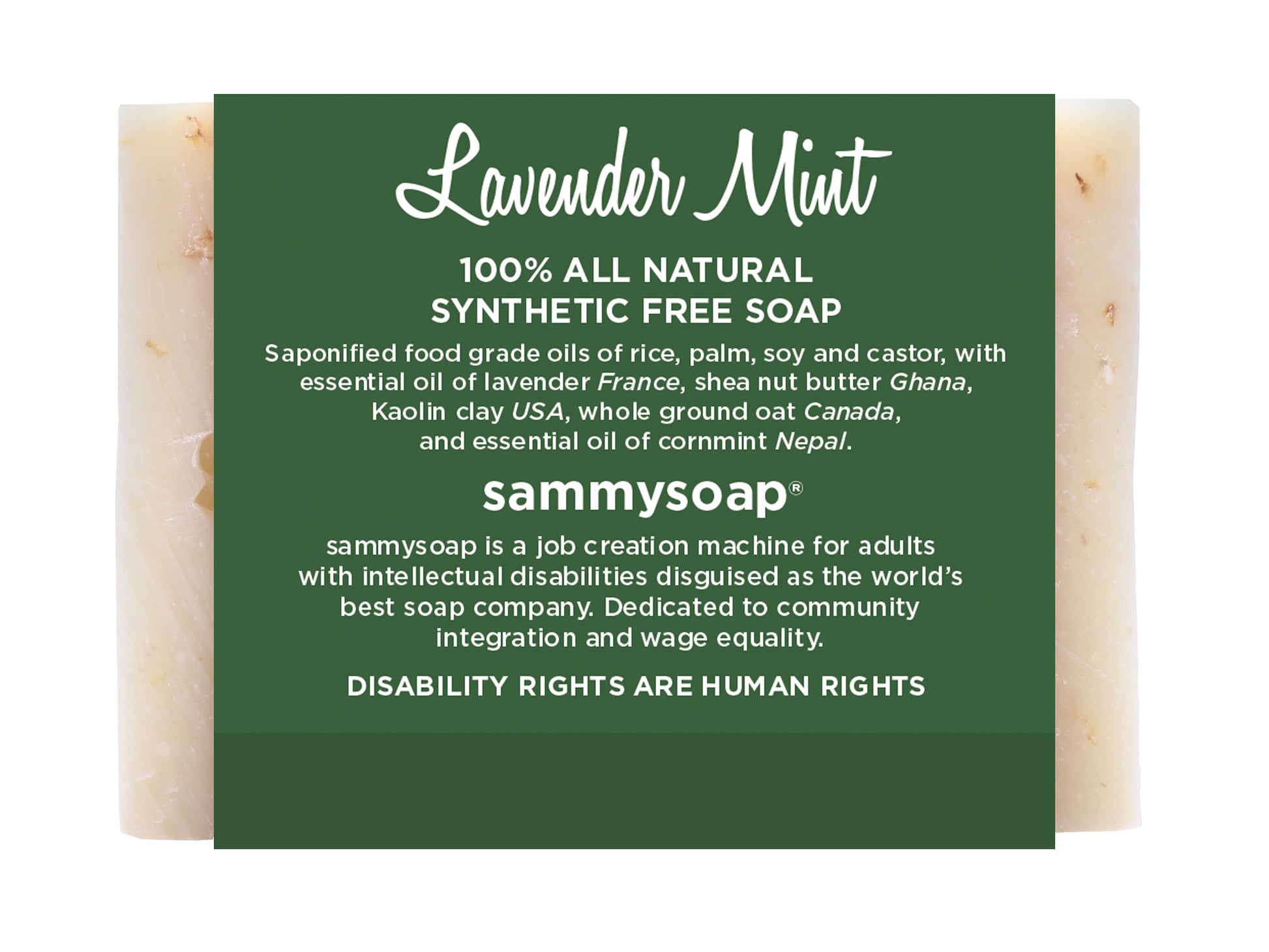 sammysoap's 100% all natural Lavender Mint is a tightly curated blend of five favorite skincare ingredients − lavender, mint, oat, clay, and shea butter. These classics combine for a soap with everyday goodness. Therapeutic grade essential oils of peppermint and lavender lift spirits and benefit stress and allergies. Their scents are calming and cheerful. Finely ground whole oat and high-end Kaolin clay combine with shea, one of nature's finest skin emollients, for a richly moisturizing and nourishing soap that lathers beautifully, cleans thoroughly, exfoliates, and tones skin. Clay pulls toxins and shrinks pores. Oat smooths, balances skin's natural pH, and soothes itchy conditions.