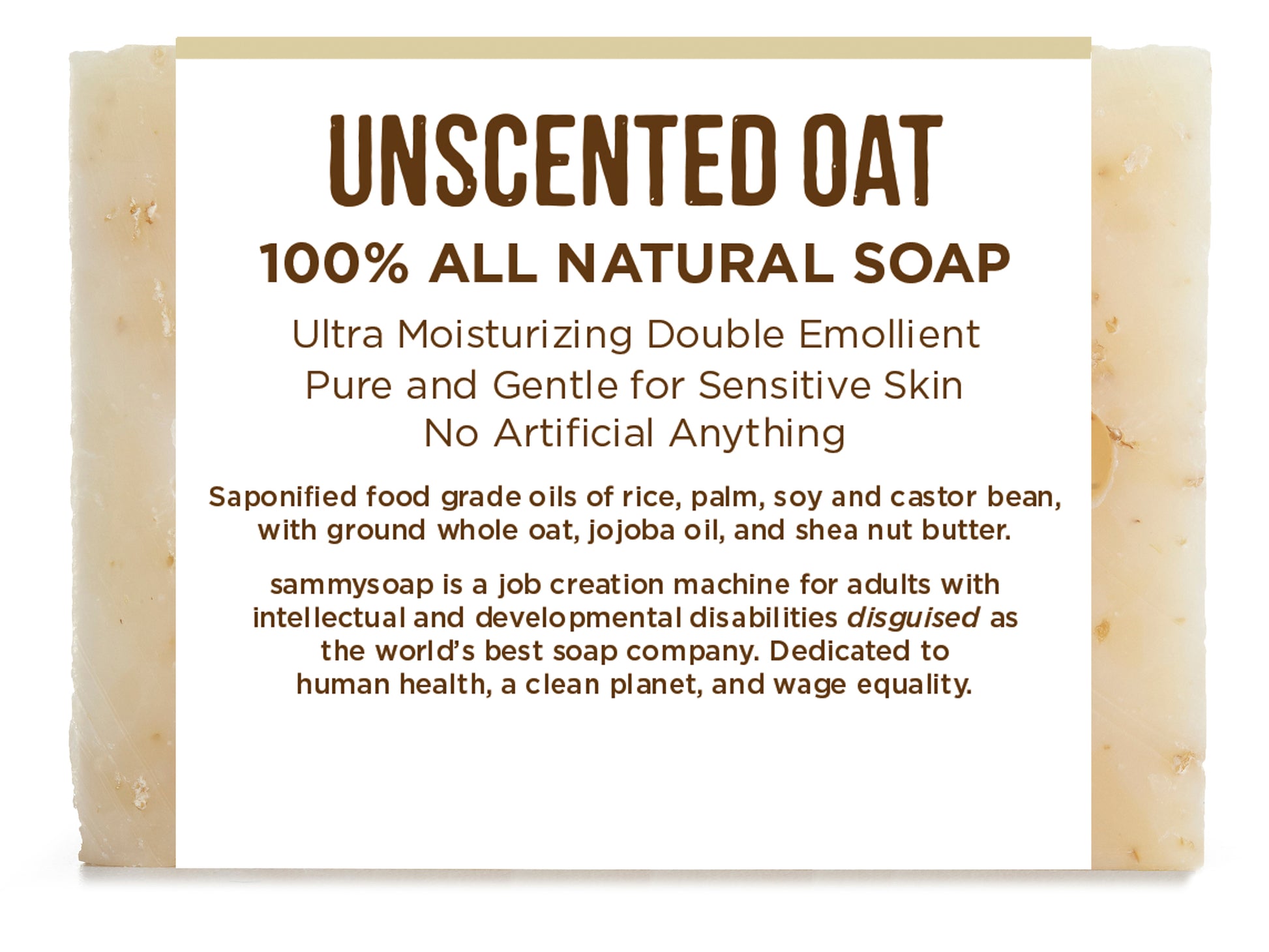 Customers love exfoliating soaps so we added oat to our popular unscented bar. Oat creates a luxurious lather that leaves a topical barrier, sealing moisture into skin. Our skin-loving unscented oat soap cleans and moisturizes with two emollients. Jojoba is a small molecule oil that sinks deep into skin to repair and replace lost moisture, increasing skin's elasticity. Shea nut is a large molecule butter that makes skin more supple by absorbing into the outer layers of skin. Butter's large molecules defend against drying winds and damaging UV rays without blocking a body's ability to manufacture Vitamin D. Together, jojoba and shea produce a natural one-two complexion-care punch that helps prevent wrinkles, sagging skin and dryness. Unscented Oat is ideal for people with itchy skin imbalances like eczema or psoriasis, people with scent sensitivities, or those that simply prefer a soap that does not compete with their favorite scent. Great for face and body.